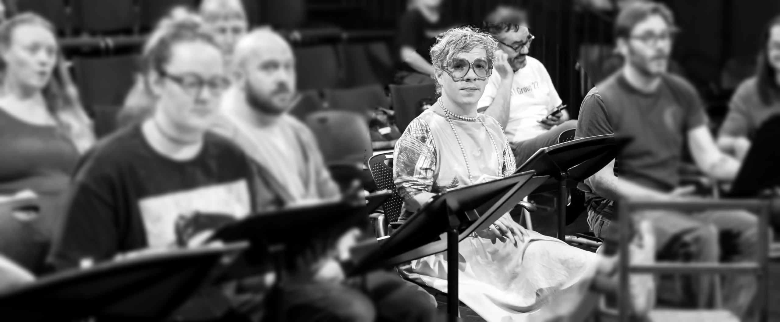 [Black and white rehearsal photo. Grant is at a music stand wearing a fabulous pair of sunglasses, a long pearl necklace, and a dress.]